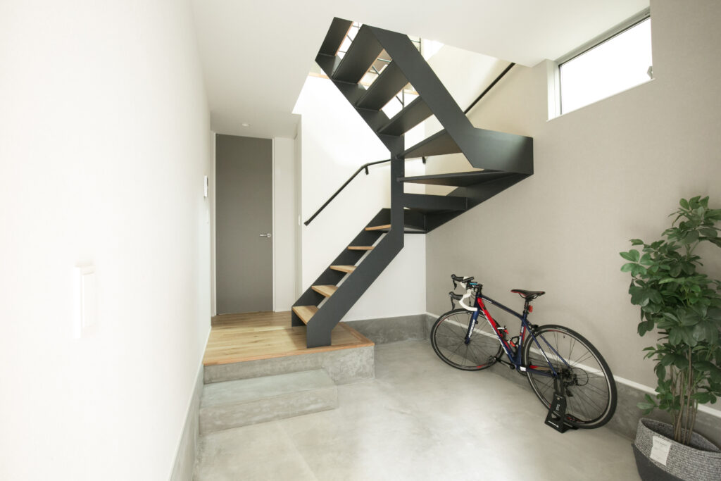 ちいさな2階建ての住まいですが玄関を入ると広々とした土間玄関と鉄骨階段がデザイン性を高めています。