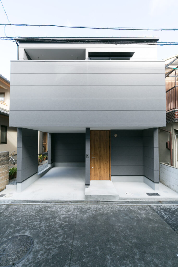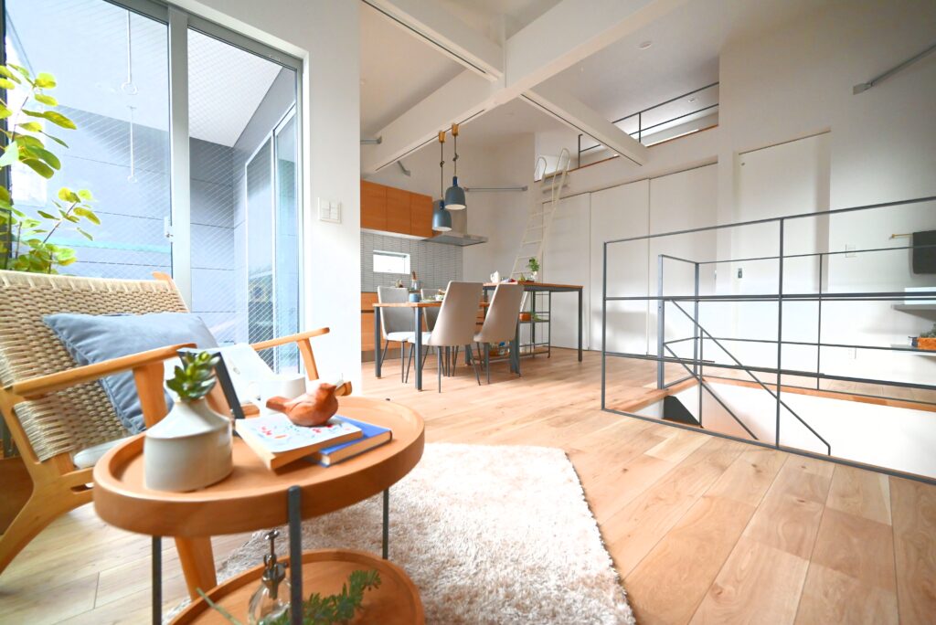 お土地の大きさから3階建てになりがちなところを「2階建ての住まいに住みたい」というご要望をかなえるため、準耐火建築物にすることで建蔽率の緩和を適用し、家族の集まるLDKが広く見えるように天井は、勾配天井で高く、階段手摺は視線が通るようにアイアン手摺りに、洗面室はLDKに面したオープンな洗面室に、バルコニーはLDKの床の延長戦に見えるように工夫し、できるだけ広く見せる工夫をほどこしました。