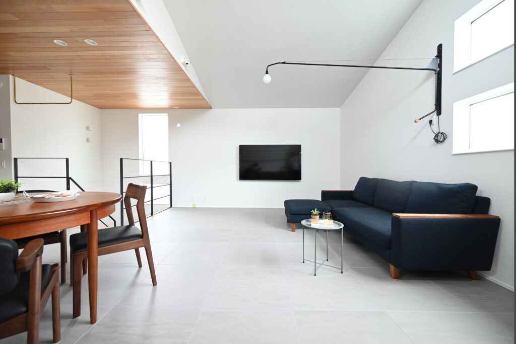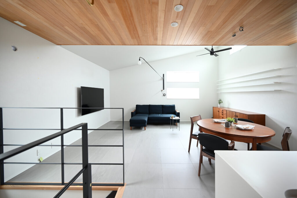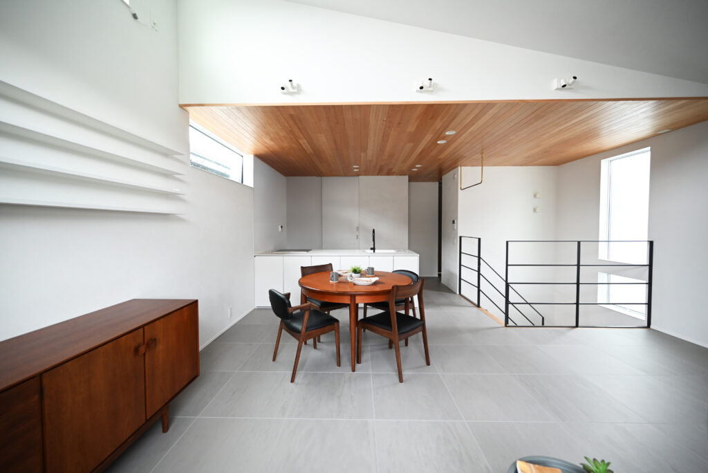 木質の天井とグレーの塩ビタイルが印象的なLDK。隣家が近く暗くなりがちな立地でも、勾配天井に近い高窓を設けることで、自然光をたっぷり取り込み、明るく開放的なLDKとなっています。
