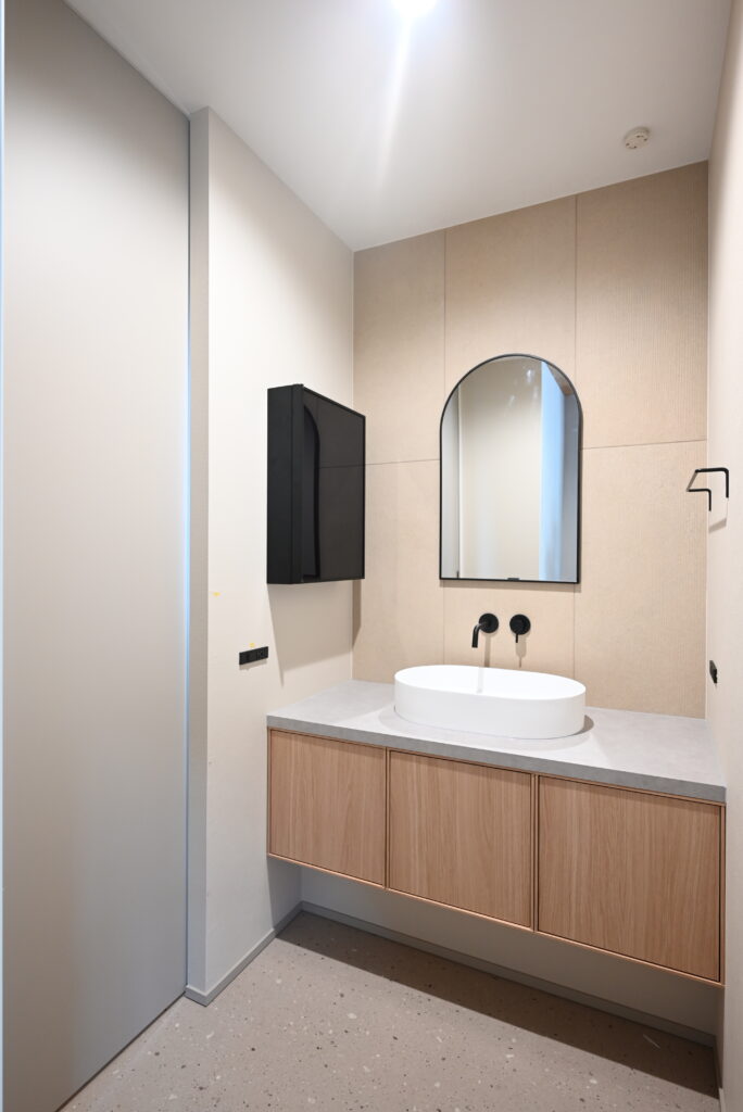 脱衣室と分けた独立型の洗面スペース。造作の洗面台は、さまざまな素材を組み合わせながらも、統一感のある上質な空間となっています。