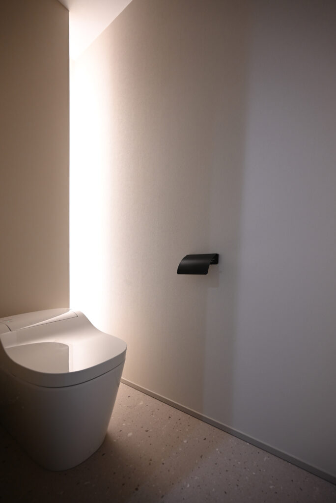 背面に隠れた収納と間接照明を組み合わせ、すっきりと上質な雰囲気のトイレ空間です。