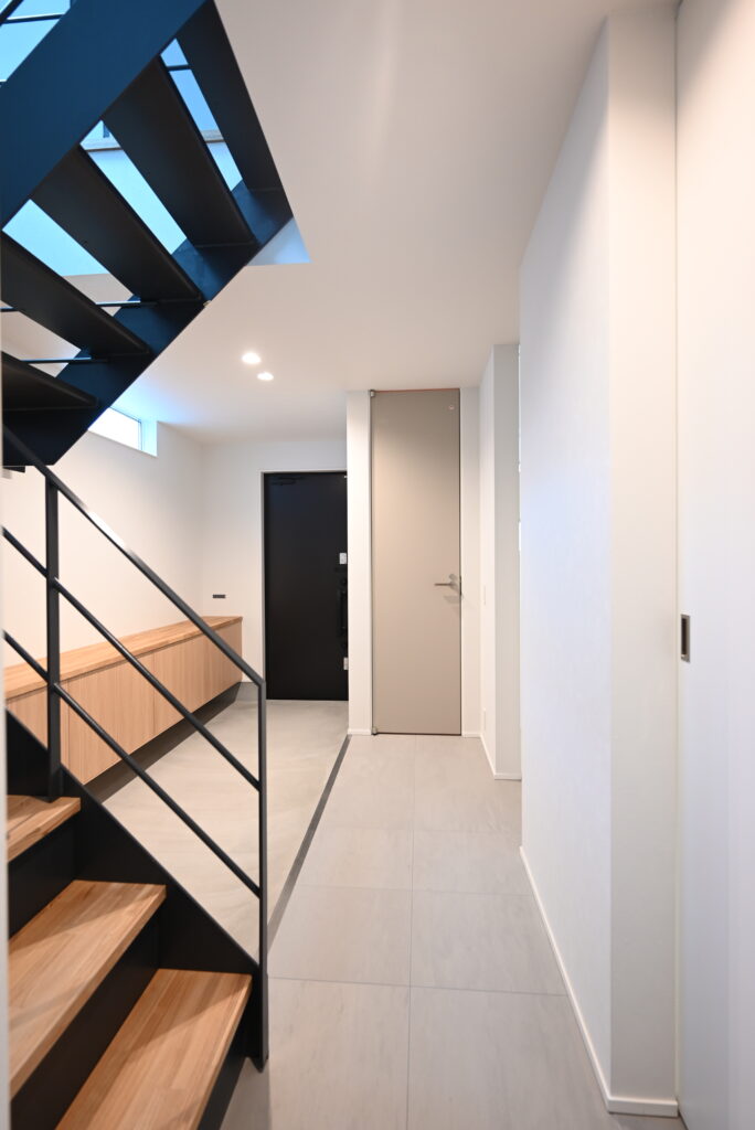 土間玄関には高さを抑えた3.6mの下足箱と、存在感のある鉄骨階段を配置。シンプルながら印象的な玄関スペースです。