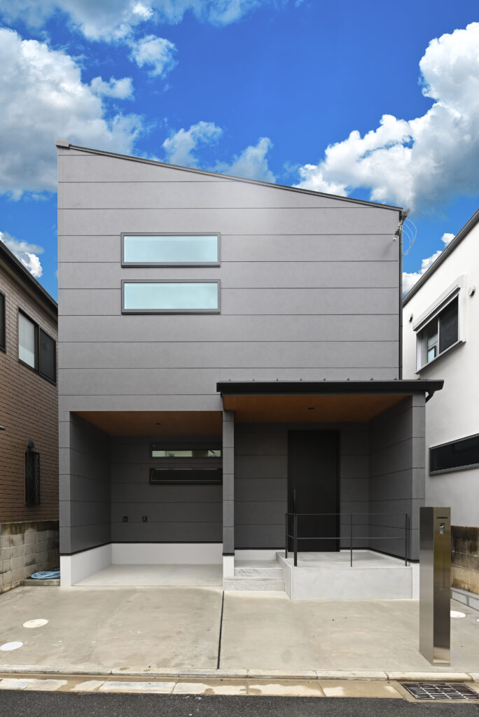 シンプルな外観に、木目調の軒天が温かみを添えるデザイン。落ち着いた雰囲気の中に、さりげないアクセントを加えています。