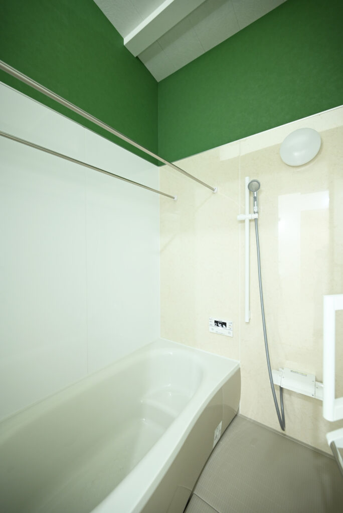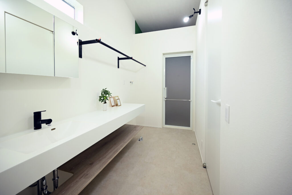 当社標準仕様のカウンタータイプの洗面台と室内物干し。