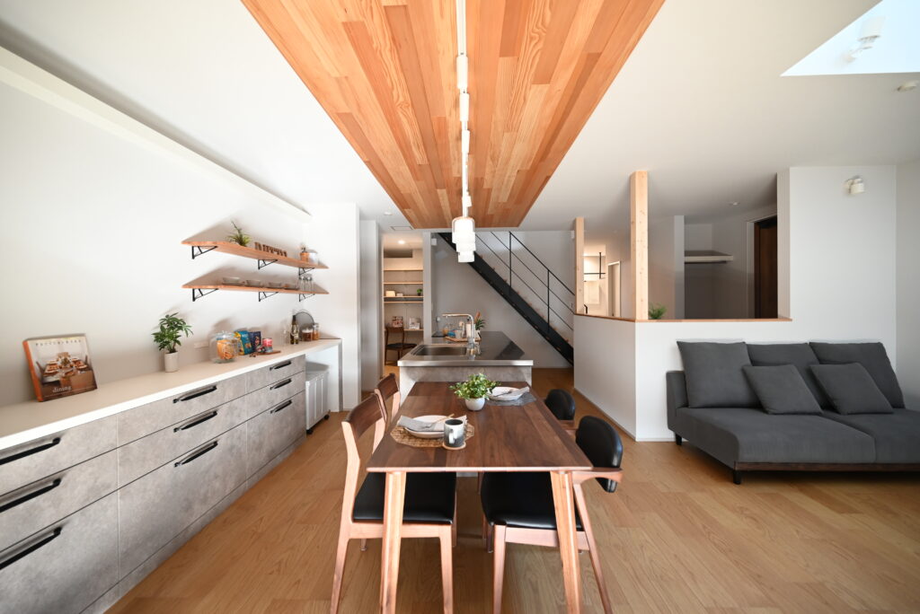 木のぬくもりを感じる板張り天井と、鉄骨階段が調和するLDK。吹抜けから光が降り注ぎ、家族が自然と集まる開放的な空間です。