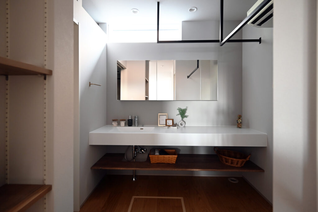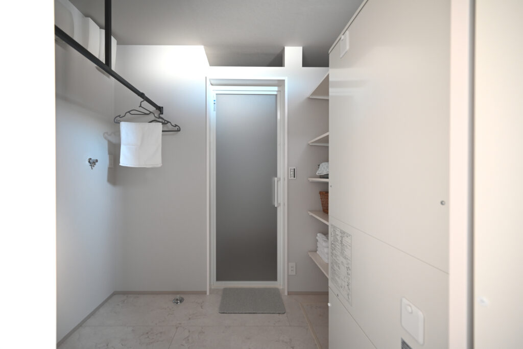 洗面台付きのランドリールームと、独立した脱衣室で家族の生活時間が重なっても安心。洗濯物は洗濯後すぐにランドリーパイプへ掛けられるスムーズな動線です。