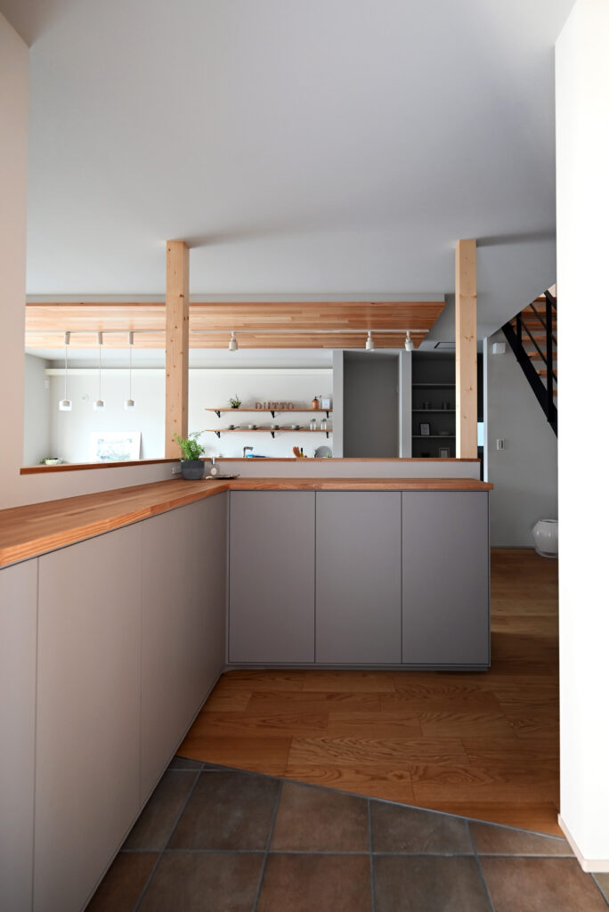 キッチンとダイニングが横並びでさらに家事ラク。背面のカップボードは、収納力はそのままに、高さを抑えているので、より広く感じられます。