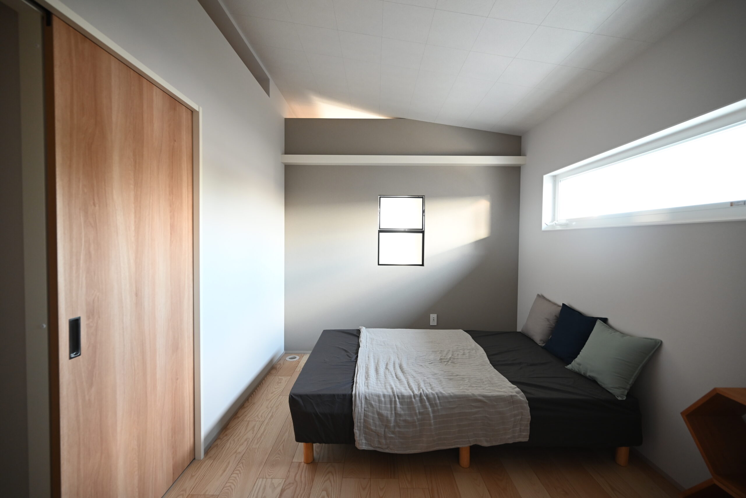 吹抜けに面した主寝室には室内窓を設け、空間のつながりとプライバシーを両立。調光式の間接照明で、シーンに合わせて雰囲気を自在に変えられる心地よい空間です。