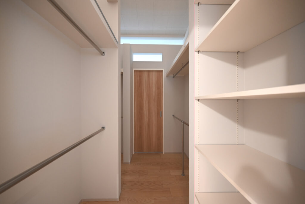 階段を上がってすぐの場所に、回遊できるファミリークローゼットを配置。洗濯物をまとめて収納できる便利な動線で、家事効率を高めます。
