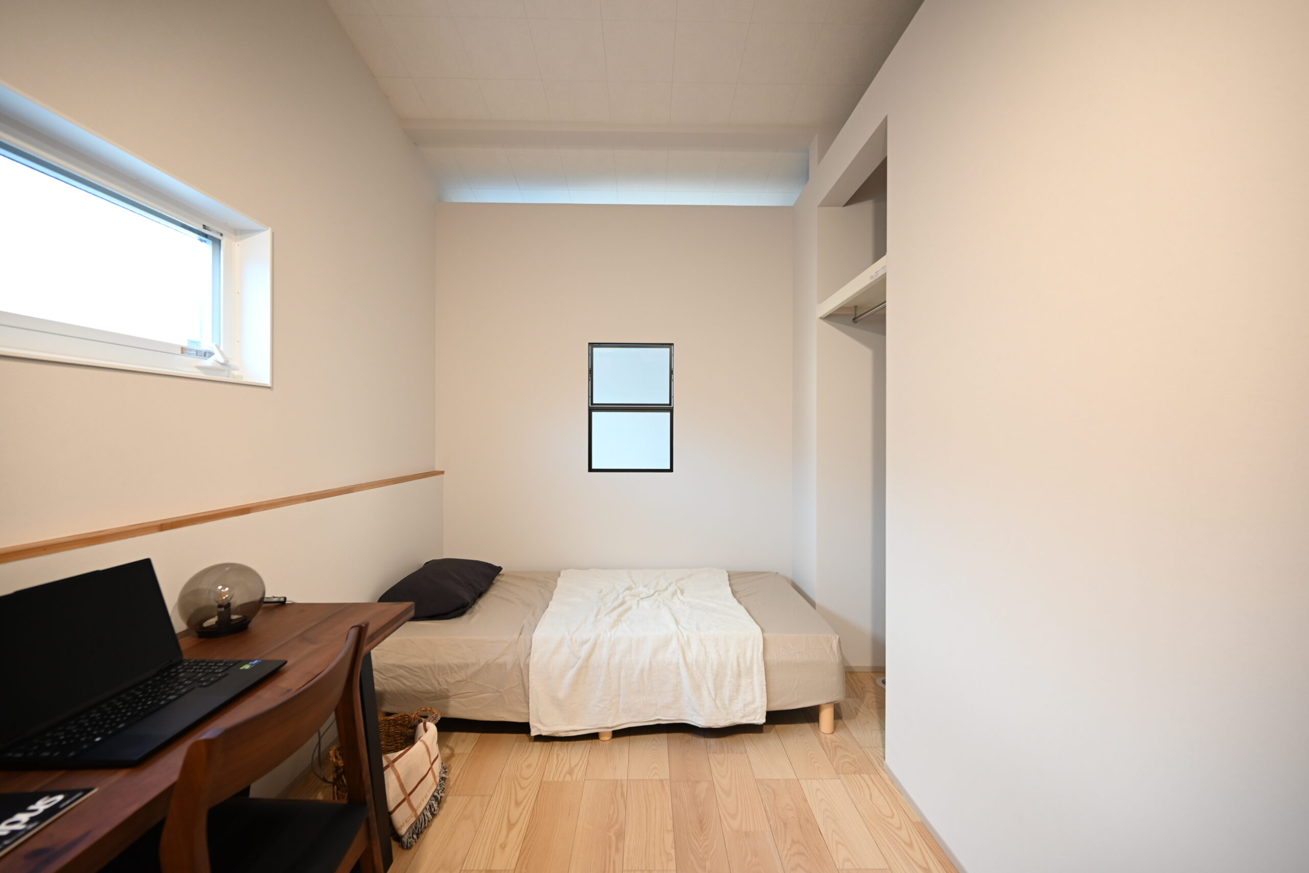 各個室には、よく使う衣類をすっきり収納できるオープン収納を設置。背面には、アクセントクロスを貼り、個性豊かな空間となっています。