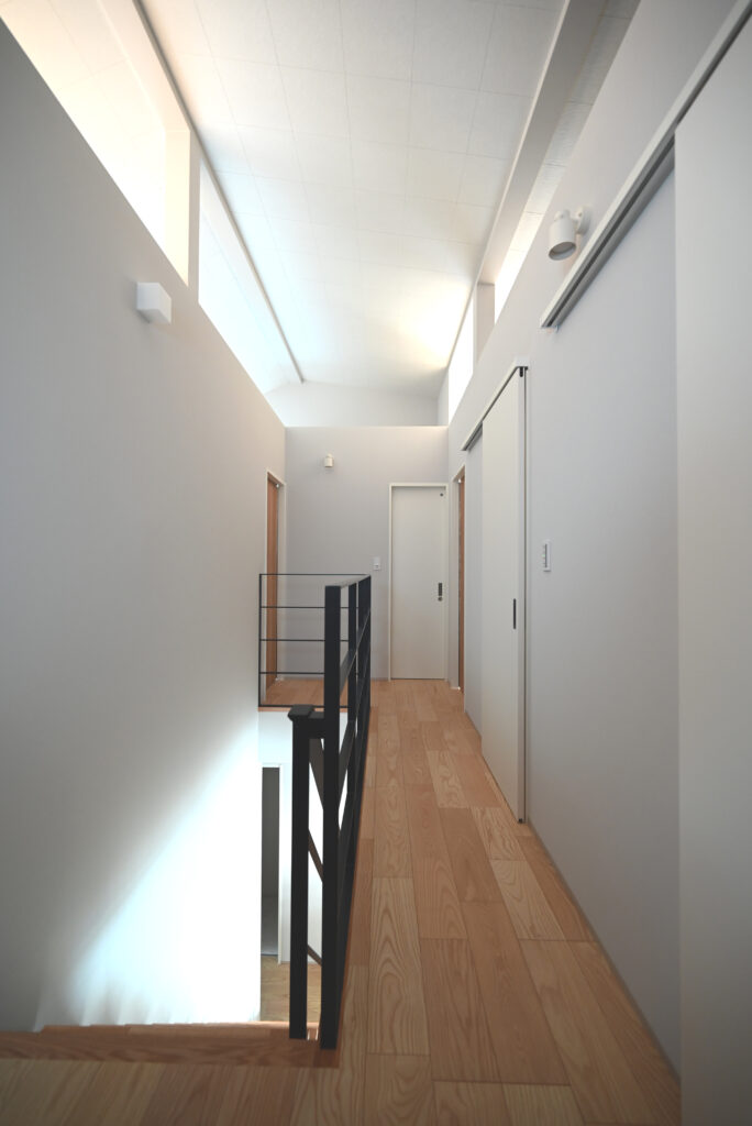 アイアン手摺と勾配天井が印象的な2階ホール。天井の高さと開放感が、空間をさらに広く感じさせます。