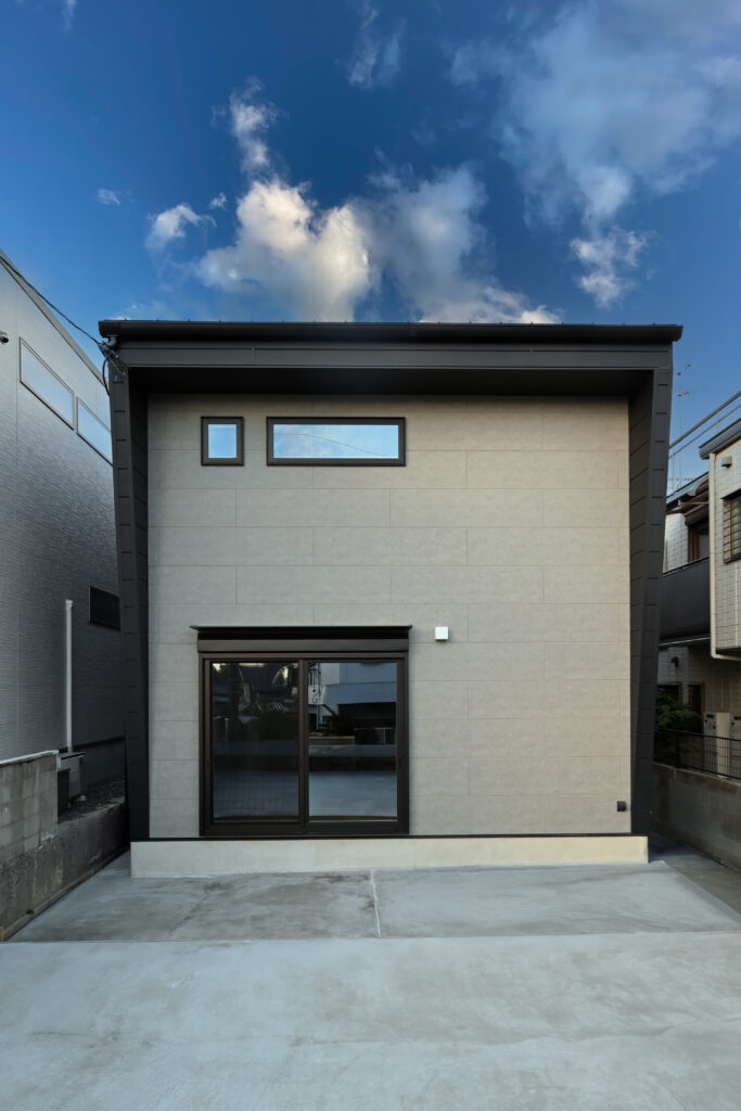 南側の屋根が夏の日差しをしっかり遮り、快適な室内環境を実現。斜めの壁が際立つ外観は、機能性と意匠性を兼ね備えたデザインです。
