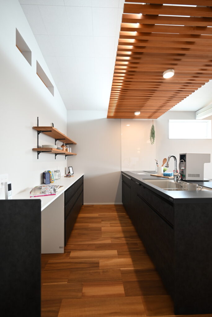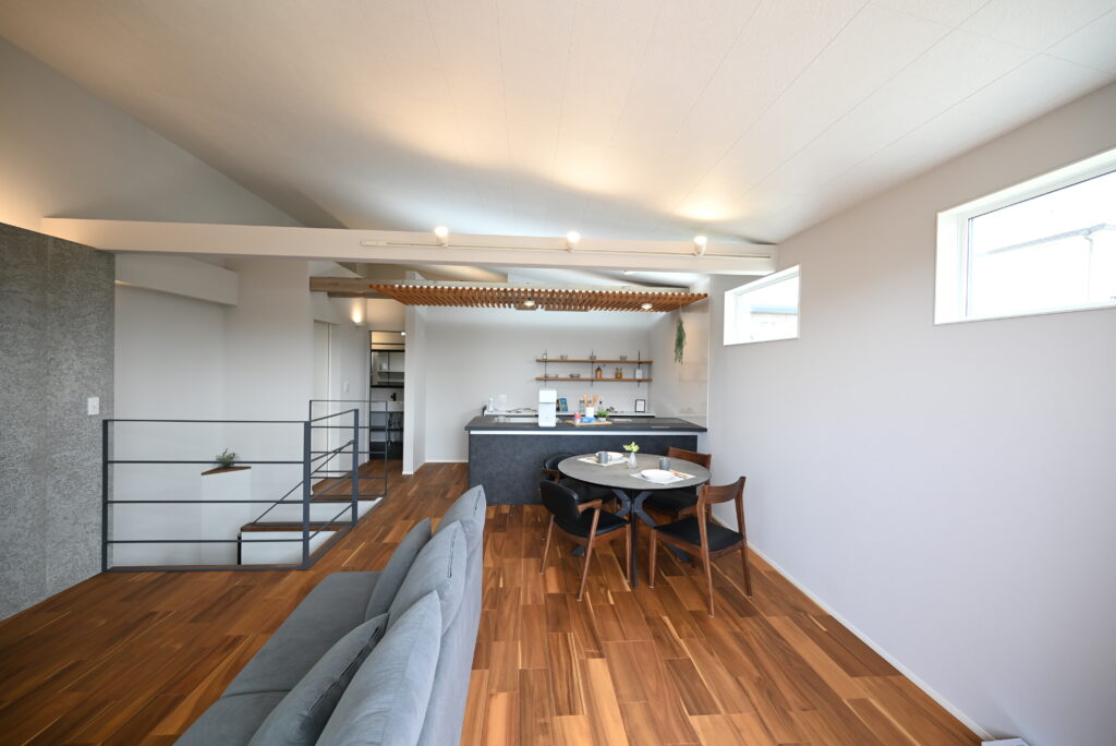 円卓と対面キッチン。キッチン上には格子木天井。LDK全て勾配天井なので広々。