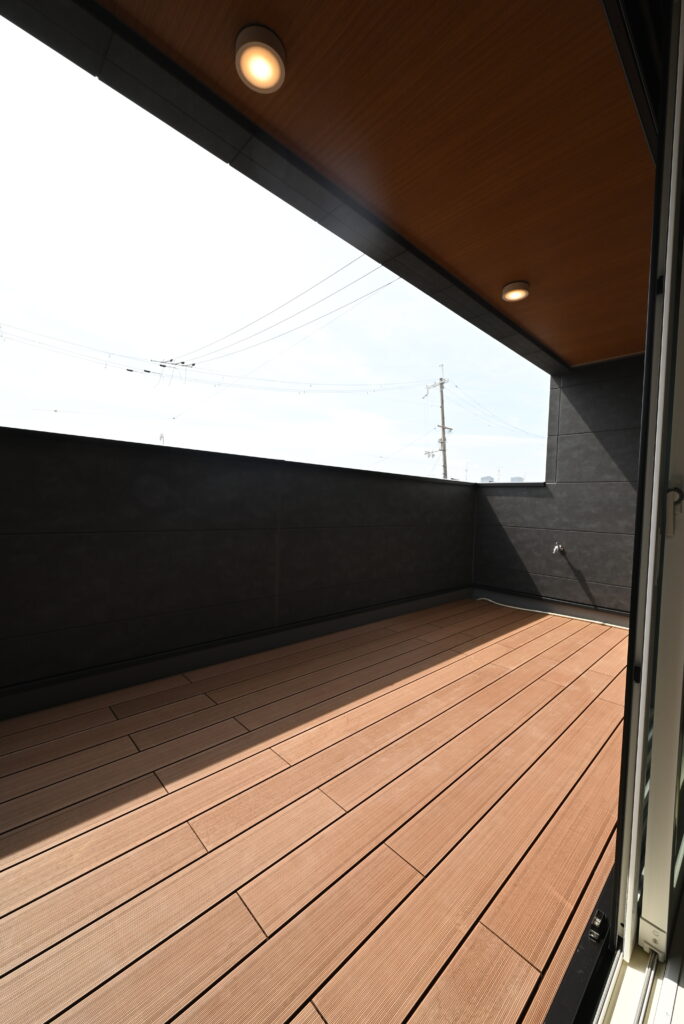 リビング横の大きなウッドバルコニー。洗濯物を干すためではなく、お子さんのプール遊びができるようにつくりました。
