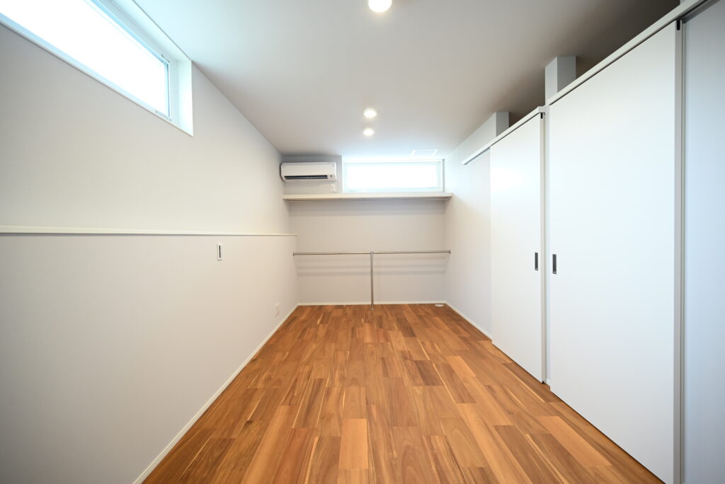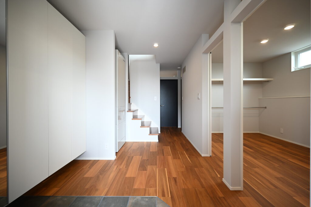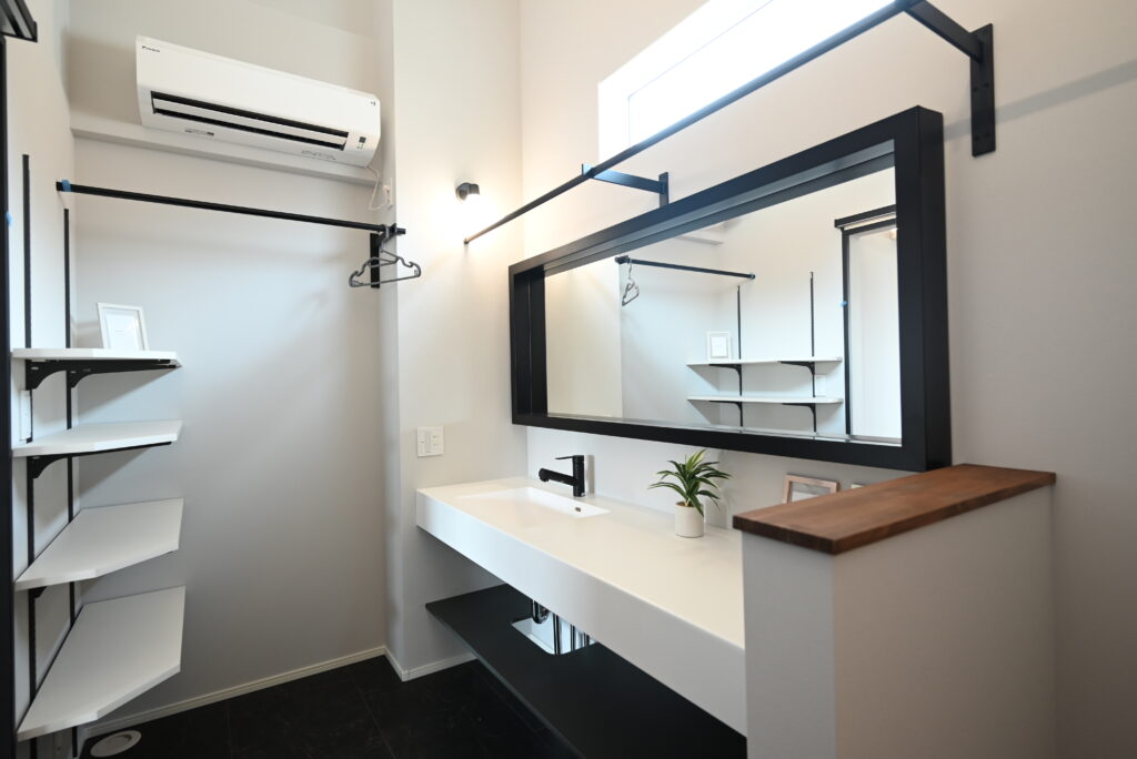 当社標準仕様のカウンタータイプの洗面台と室内物干し。施主様こだわりのブラックの縁の鏡。