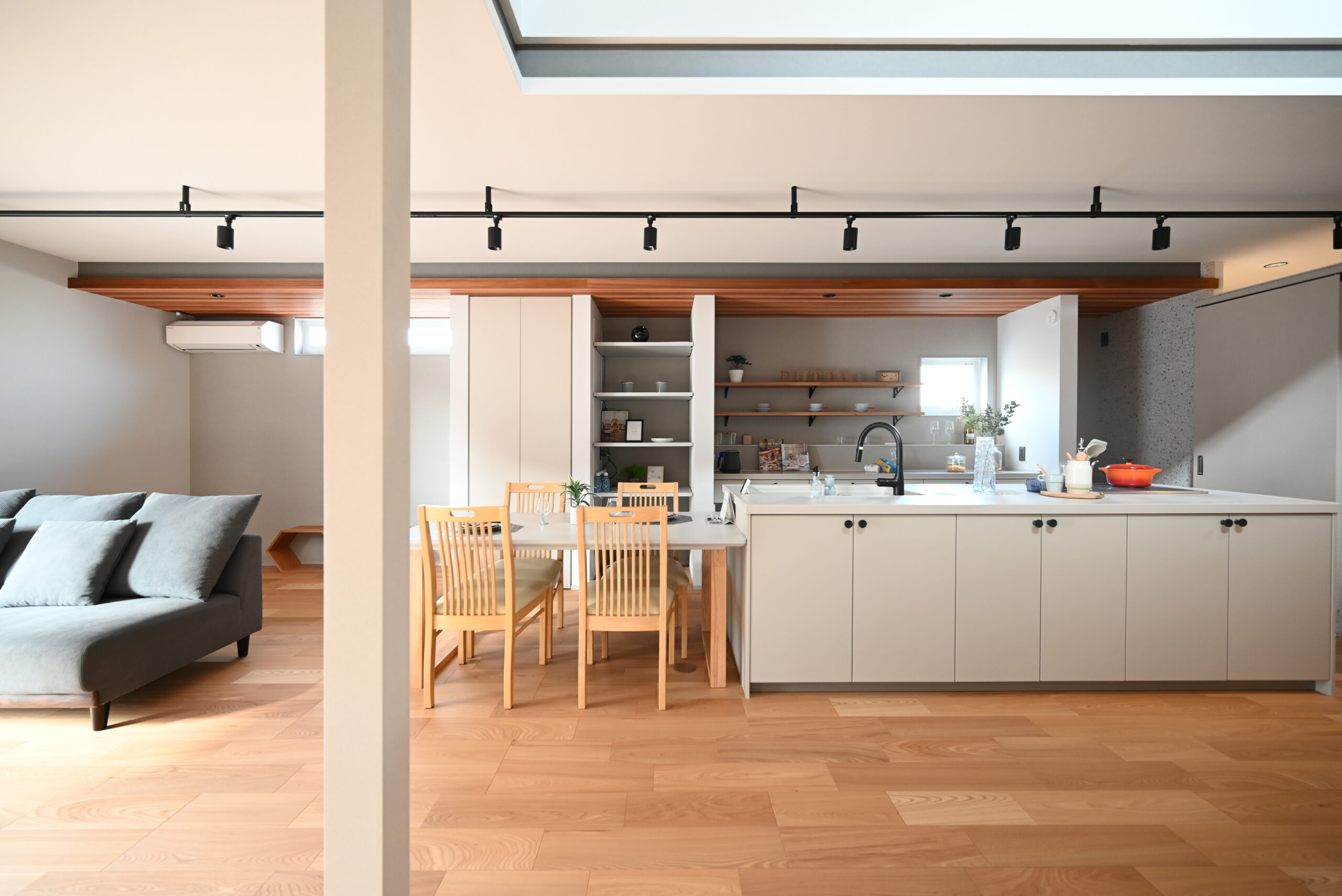 家事がラクになるアイランドキッチン。ダイニングテーブルもキッチン横に。カラーリングはベージュとグレーでコーディネイト。24帖のLDKでも家中6帖用エアコン1台で冬中あたたかく過ごせます。