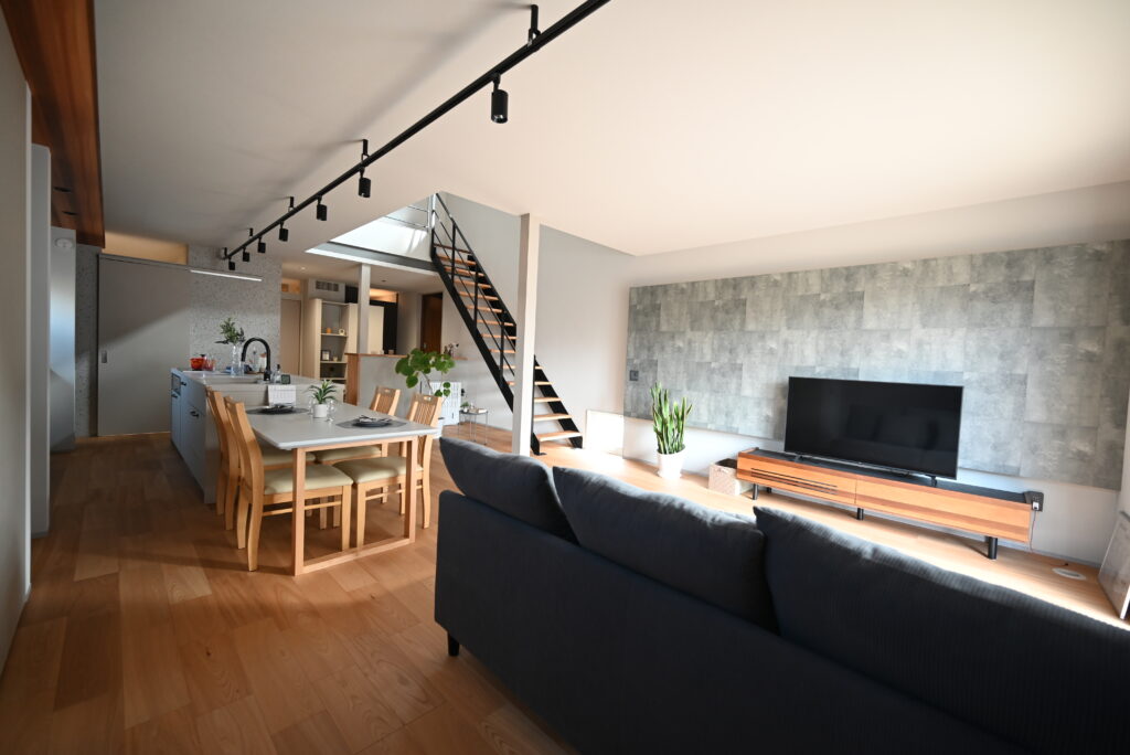 リビングは、テレビの背面をアクセントにしています。照明器具は、配線ダクトを天井から吊り下げることでLDK全体を演出。