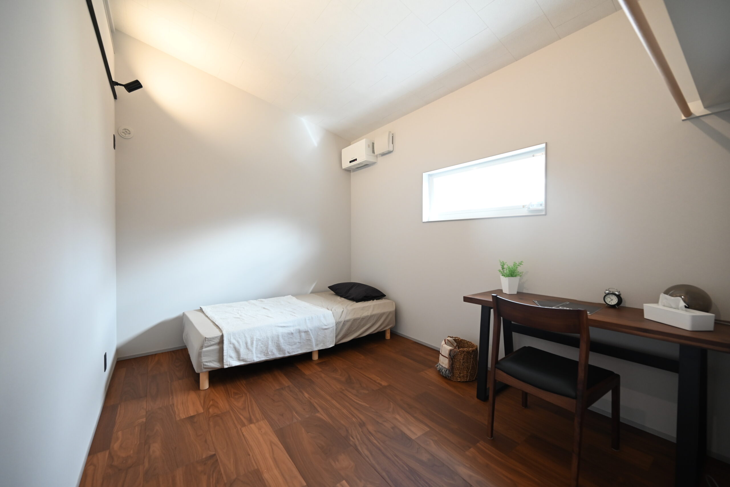 吹抜けに面した主寝室には室内窓を設け、空間のつながりとプライバシーを両立。調光式の間接照明で、シーンに合わせて雰囲気を自在に変えられる心地よい空間です。