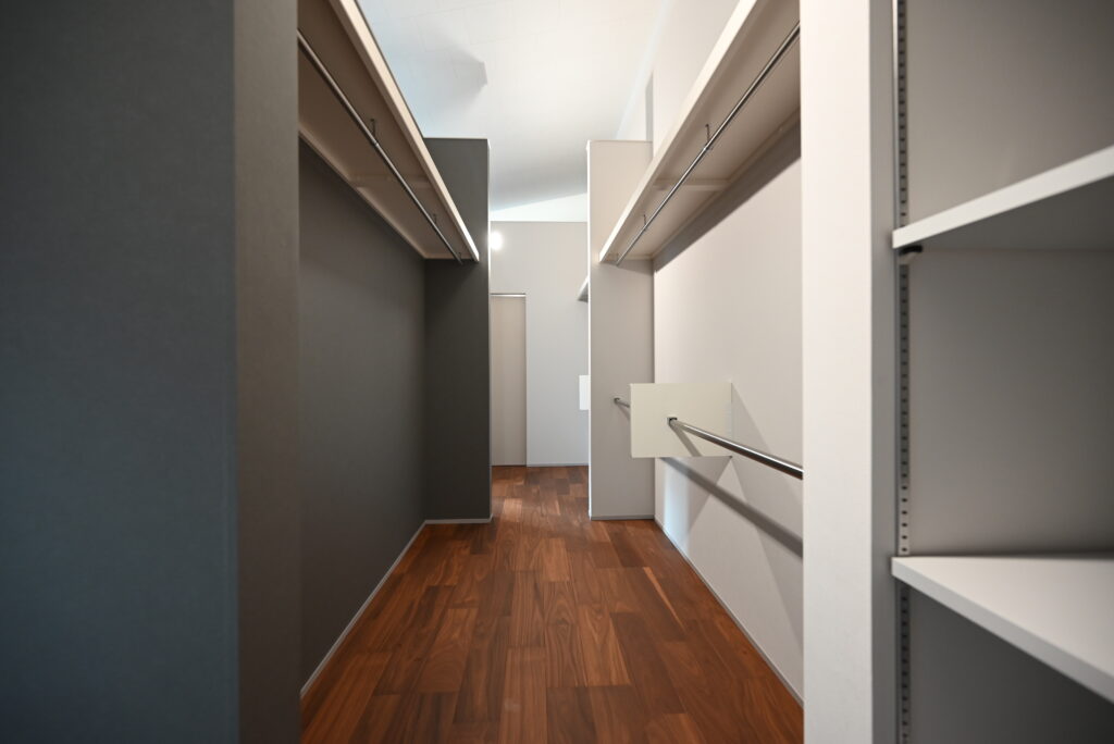 階段を上がってすぐの場所に、回遊できるファミリークローゼットを配置。洗濯物をまとめて収納できる便利な動線で、家事効率を高めます。