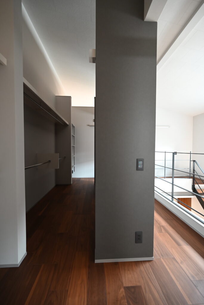 2階にあがると吹き抜けと広々としたホール。奥にファミリークローゼットが隠れています。