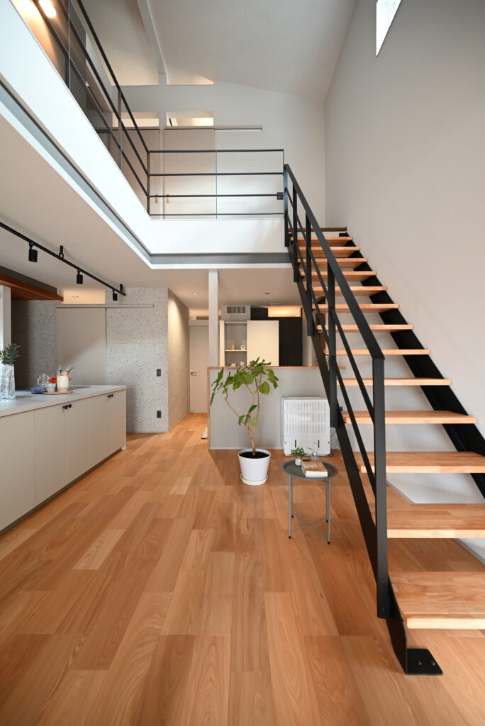 LDKには、大きな吹抜けがあり、当社標準の鉄骨階段を設置。大きな吹抜けがあっても6帖用エアコン1台で冬中あたたかく過ごせます。